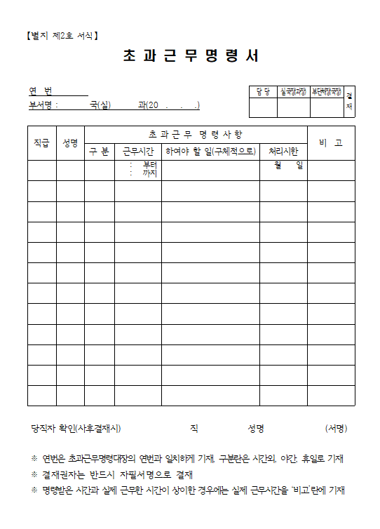 문서서식 [서식] 개인별 초과근무 내역 통보.hwp 공부는 평생 2023. 5. 23. 제목: 개인별 초과근무 내역 통보.hwp 사전 초과근무명령 신청, 근무명령 또는 초과 근무후에 다음날 초과근무명령권자의 승인, 익일 초과근무 내역보고, 승인분에 대한 개인별 실적누계 및 초과근무내역의 통보 등의 절차를 전산시스템에 반영하여야 합니다. 초과근무 내역 통보 다운로드 공유하기 게시글 관리 공부는 평생 저작자표시 비영리 변경금지 (새창열림) 댓글